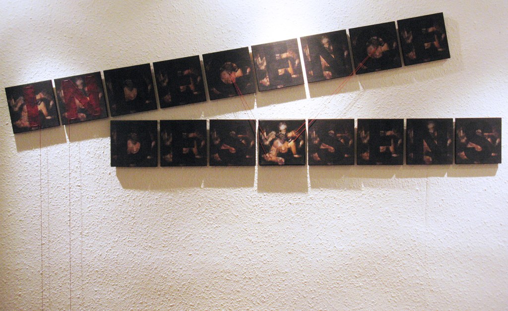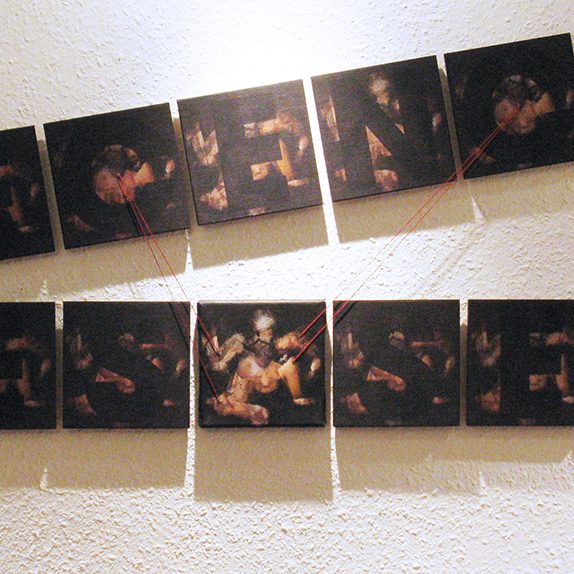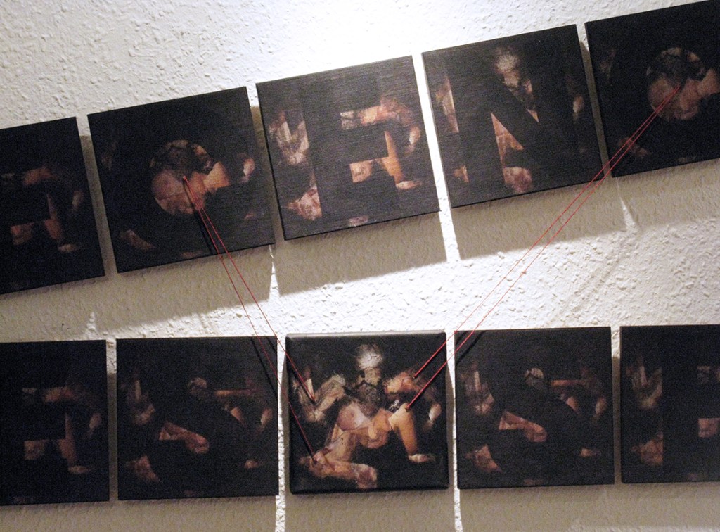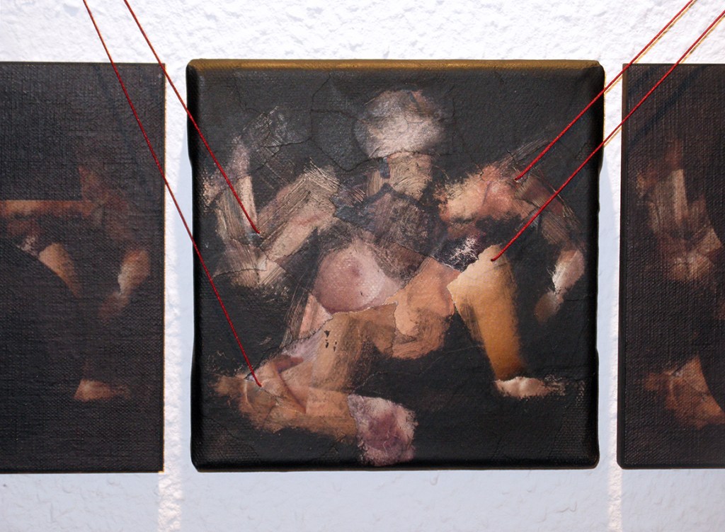 Tableau-installation évoquant la passion charnelle qui prend aux tripes, qui oscille entre plaisir et souffrance. La toile originelle, représentant un corps lascif exhibant sans pudeur différentes facettes de sa sexualité, est répétée pour exprimer le côté obsessionnel qui peut découler de l’état passionnel. Ces reproductions parlent de décence ou d’indécence et s’articulent autour de ce corps intégralement dévoilé.