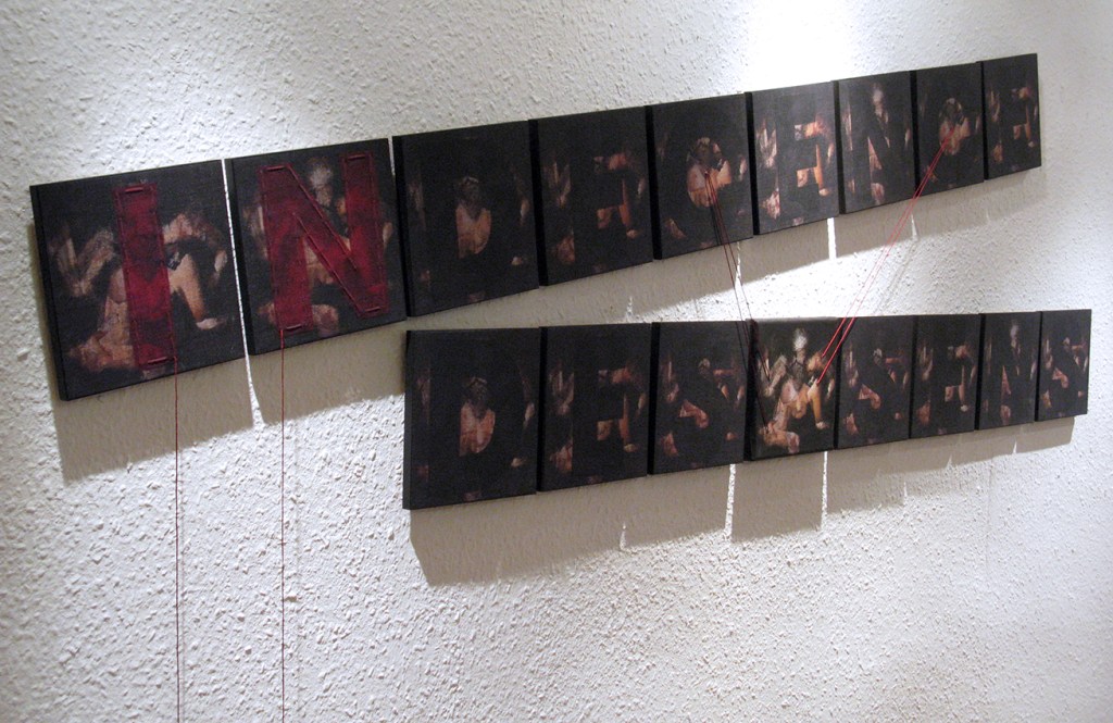 Des lettres noires, démesurées et puissantes, révèlent plus ou moins le sujet multiplié. Deux lettres rouges, inversion sémantique, sont comme cousues sur la toile. Cette couture évoque à la fois les cicatrices des plaies occasionnées par les ardeurs irraisonnées mais aussi les fils subtils qui créent la passion et relient les êtres. Le poids des lettres et le rythme des sons jouent avec le sens des mots et des émotions. Ce corps dévoilé, sujet à la passion ou jouet de ses passions, peut faire basculer ce fragile équilibre qui ne tient qu’à un fil et qui risque à tout moment de se rompre. Sans volonté, balloté par ses pulsions, il est comme un pantin écartelé entre décence et indécence des sens !
