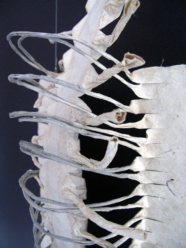 Finalement, cette création-procession induit un processus de libération de la structure rigide et douloureuse qui soutient mais qui peut également enfermer, laissant derrière elle une enveloppe vide, déformée et presque diaphane, fragilisée par l’absence du noyau central.