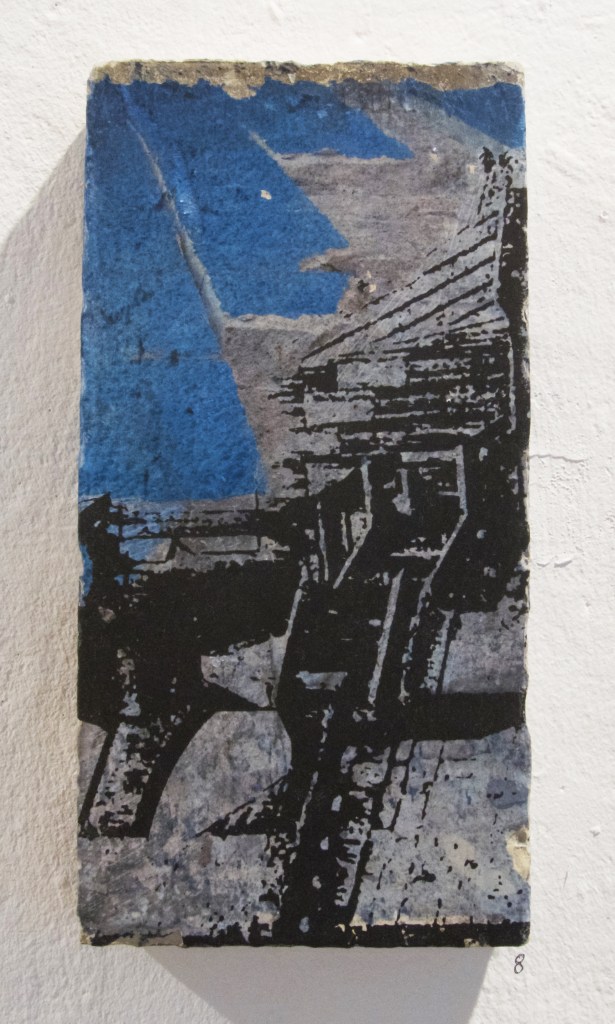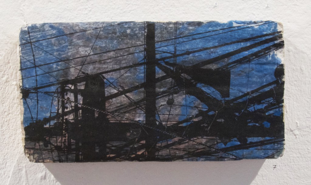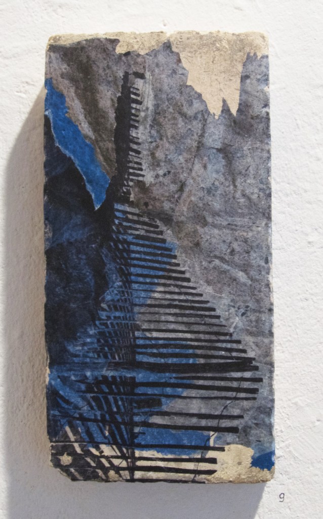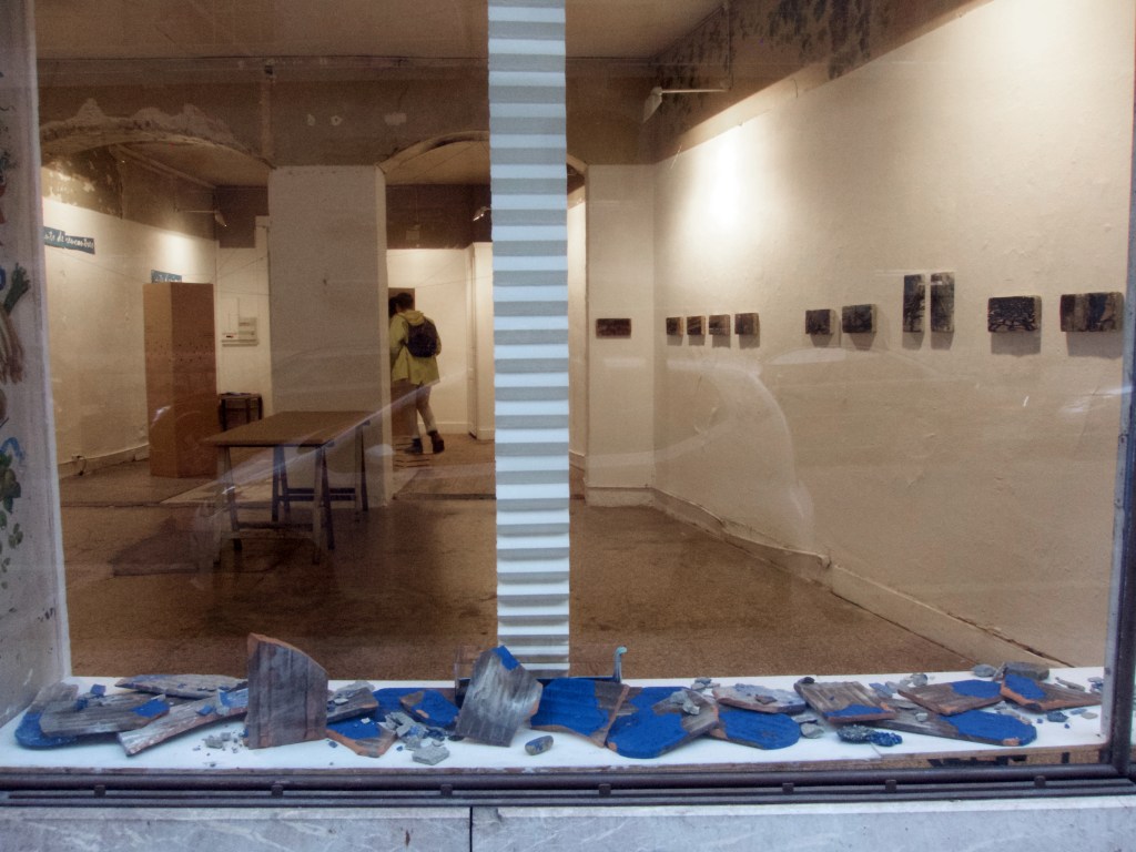 Bribes d’images, bouts de bleu, bout de vie… se rencontrer aussi artistiquement, dialoguer avec ces images sauvées et ainsi raconter, avec notre histoire en trame de fond, d’autres histoires… avec le bleu comme fil rouge ! Dans l’Espace Ruine, chacun a proposé 12 (nombre symbolique de l’année écoulée) pièces en dialogue les unes avec les autres.
