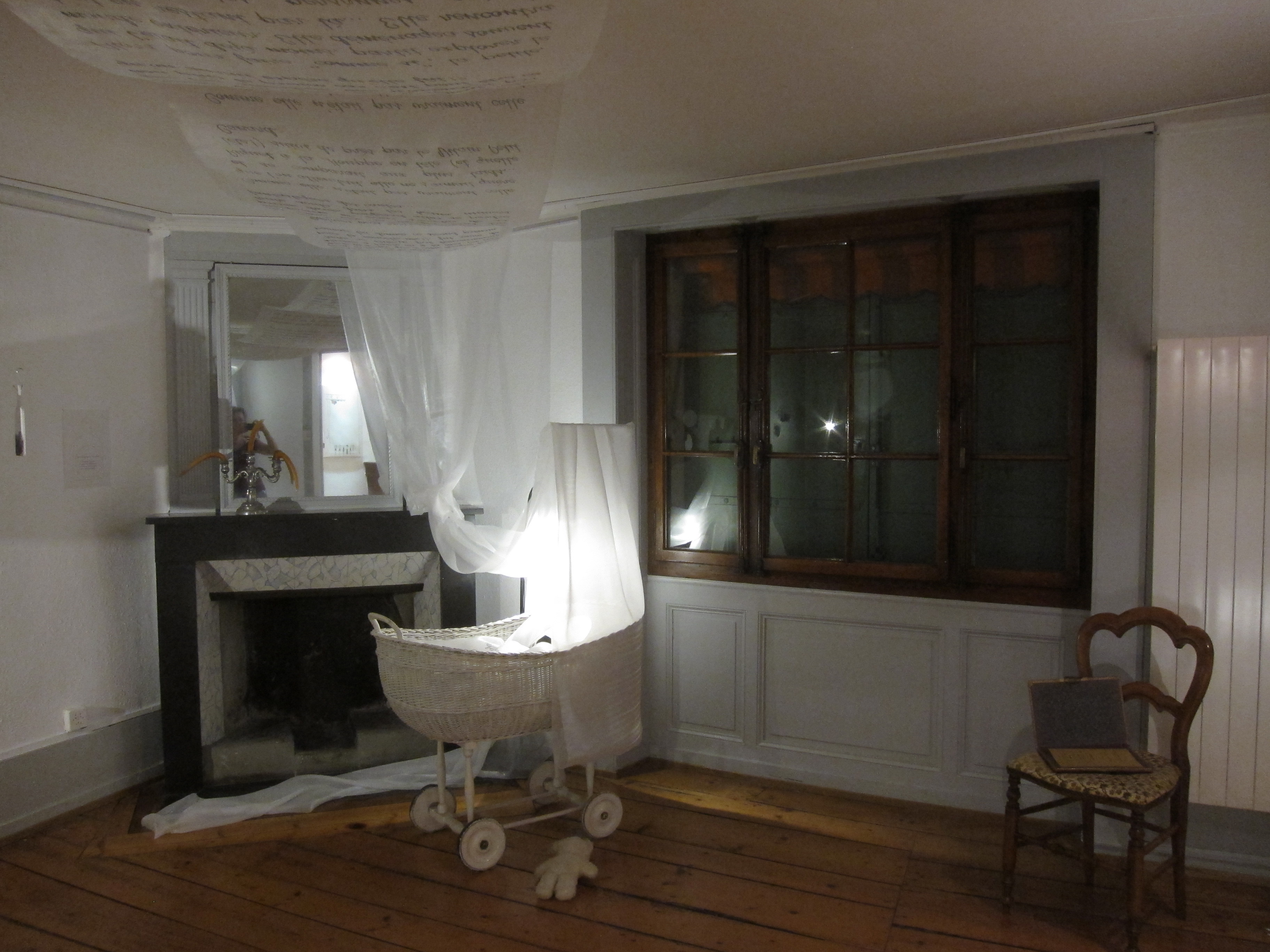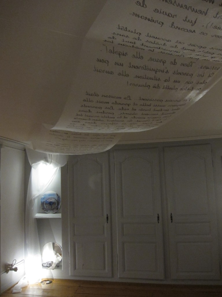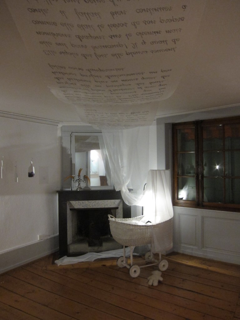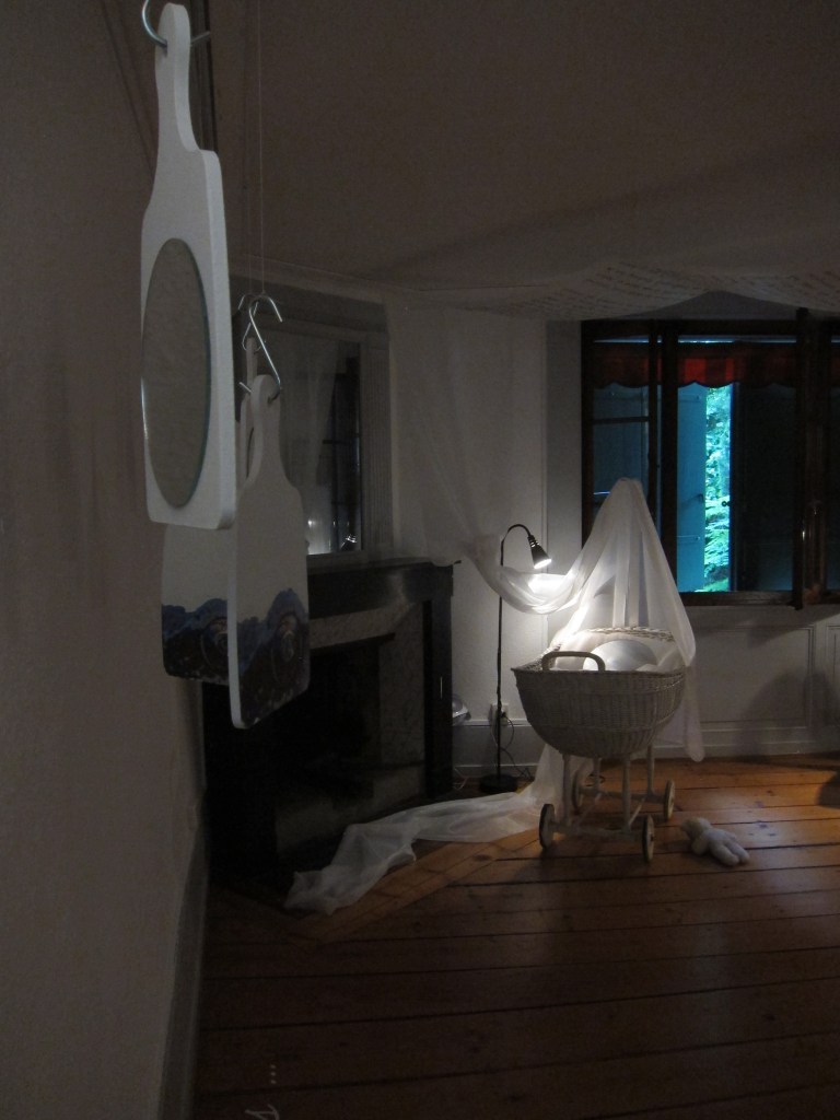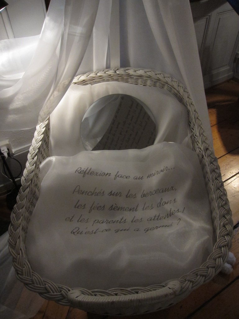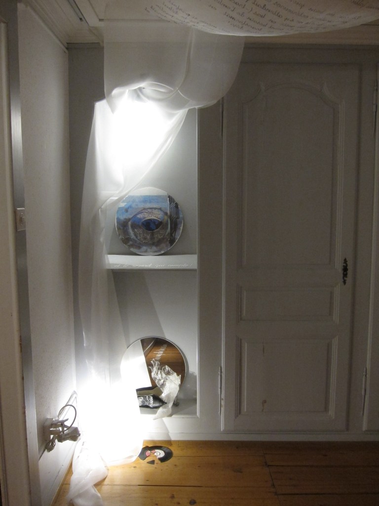 Installation interactive, 2017 Composée de différents éléments : une grande toile intitulée Conte à rebours (collage sur toile), 2 petits tableaux ronds (technique mixte) avec 1 miroir, 1 disque 45 tours cassé et 1 chaussure de bal (tissu moulé), le berceau avec son “voile-livre“ et les 10 “miroirs-contes“ intitulés Ces contes qui font miroir à nos histoires… et du texte écrit au sol.