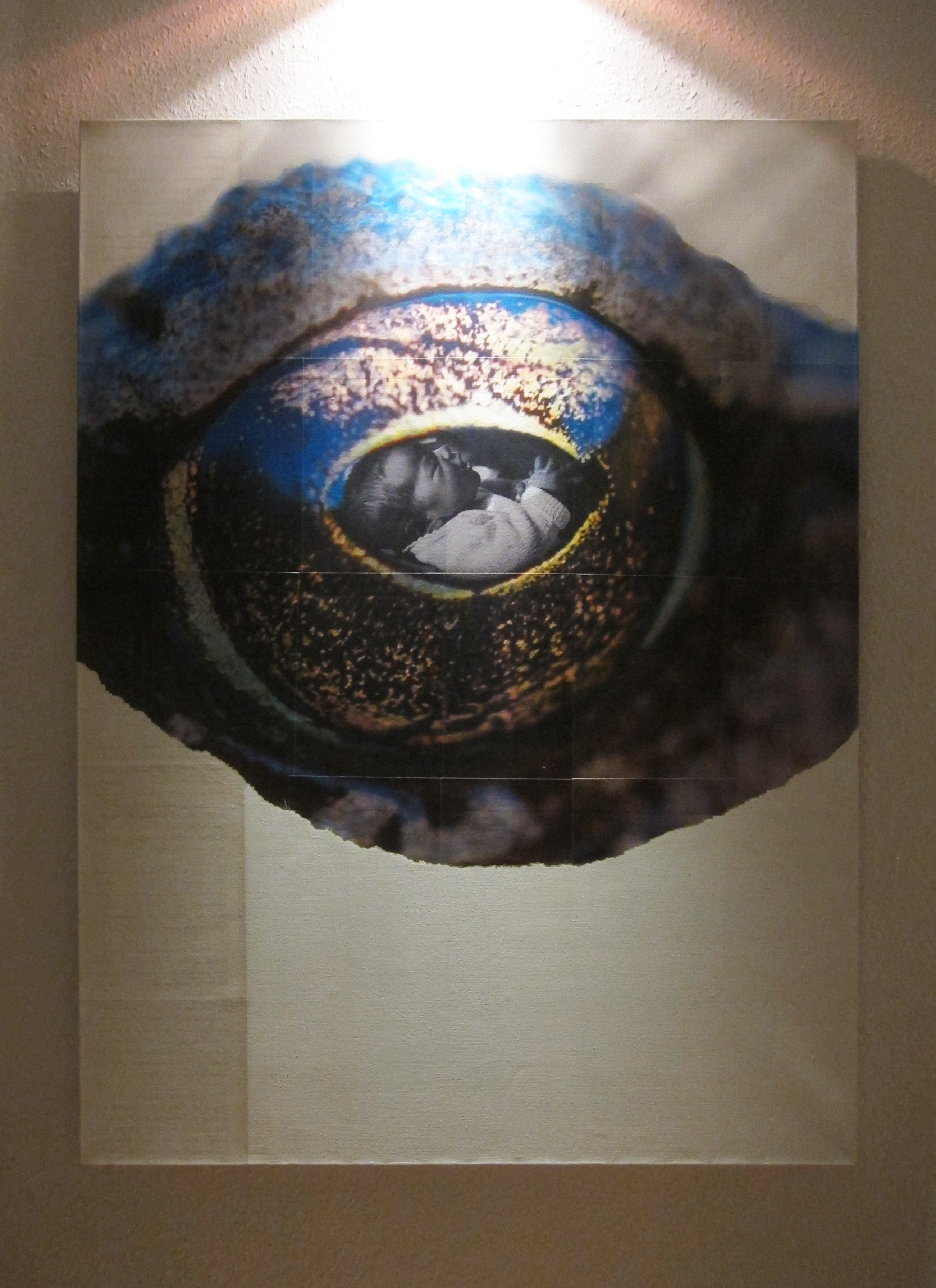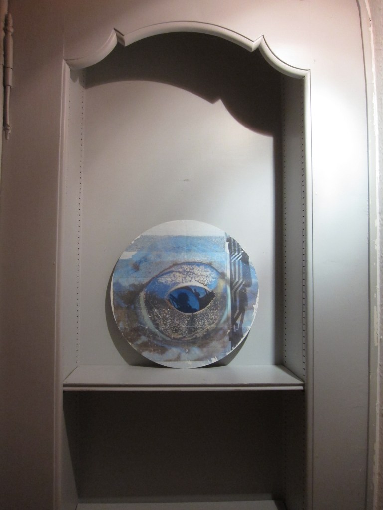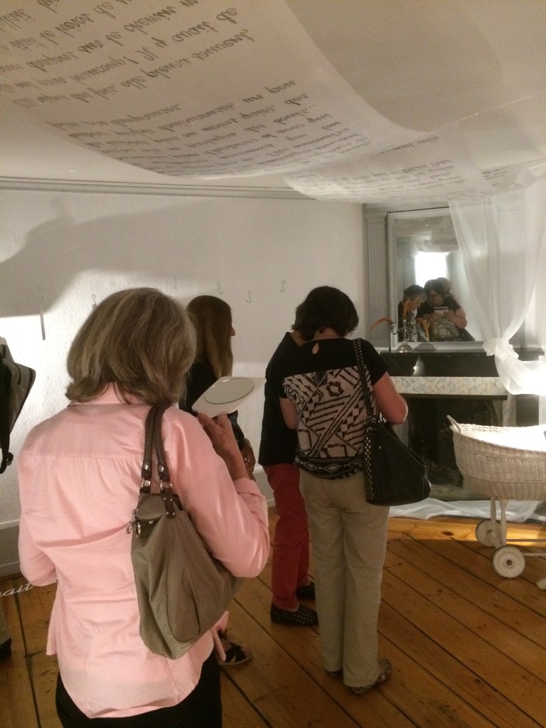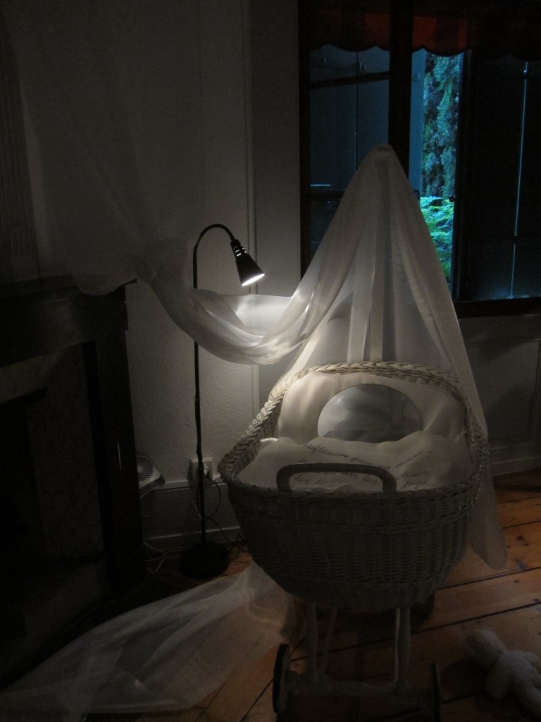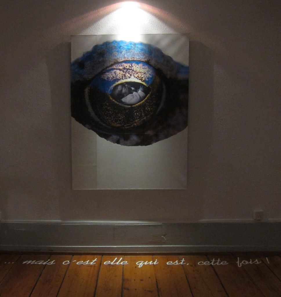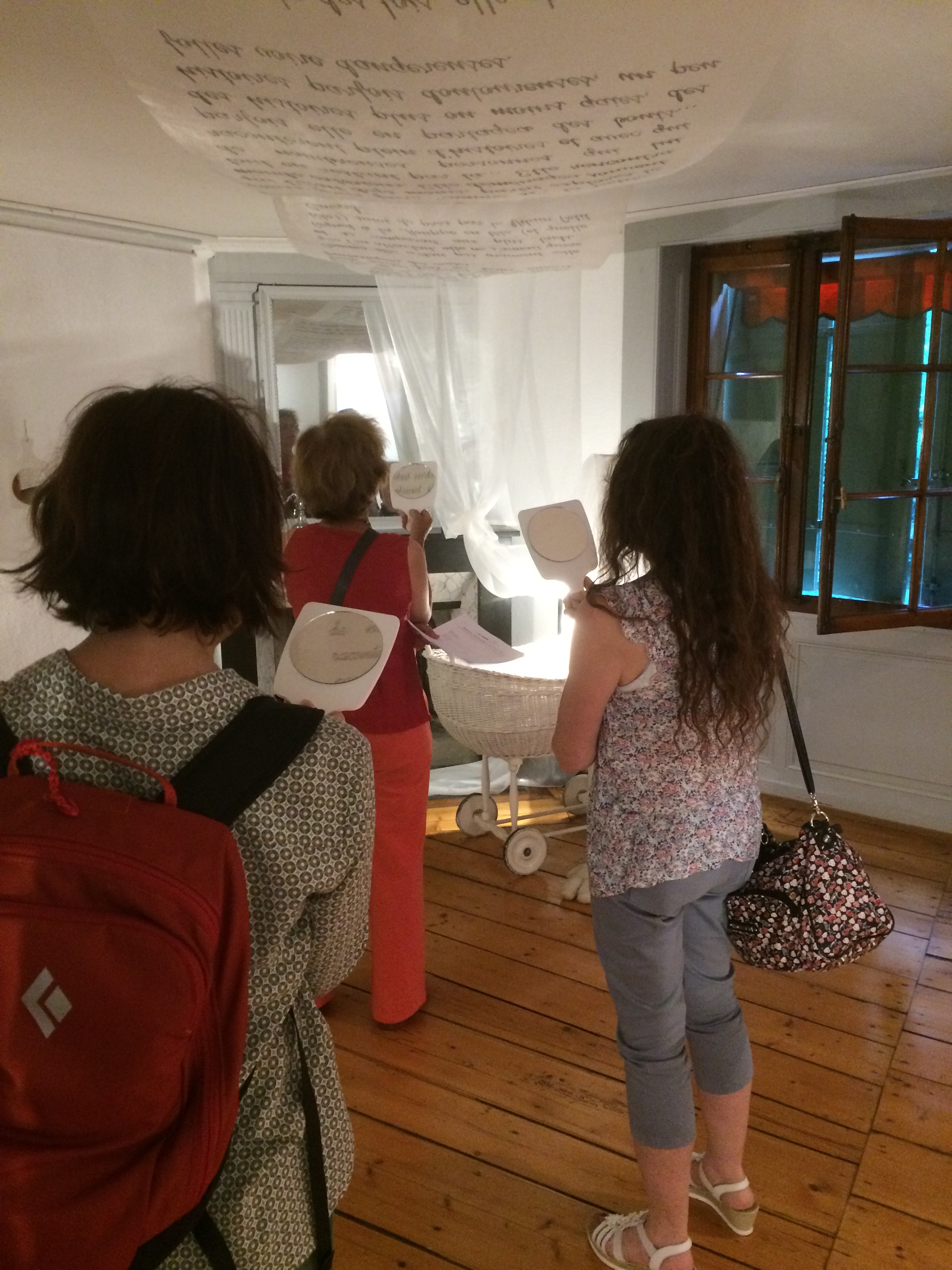 Installation interactive, 2017 Composée de différents éléments : une grande toile intitulée Conte à rebours (collage sur toile), 2 petits tableaux ronds (technique mixte) avec 1 miroir, 1 disque 45 tours cassé et 1 chaussure de bal (tissu moulé), le berceau avec son “voile-livre“ et les 10 “miroirs-contes“ intitulés Ces contes qui font miroir à nos histoires… et du texte écrit au sol.