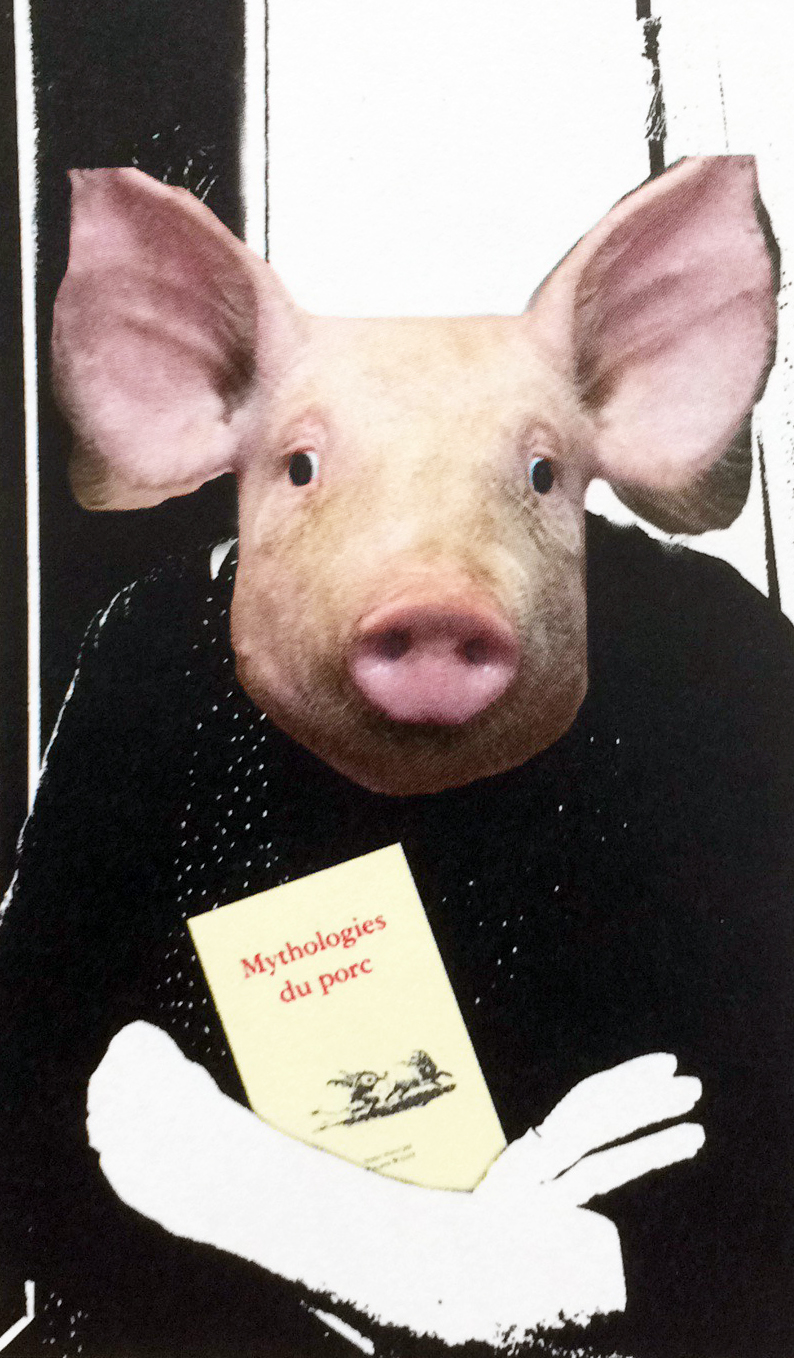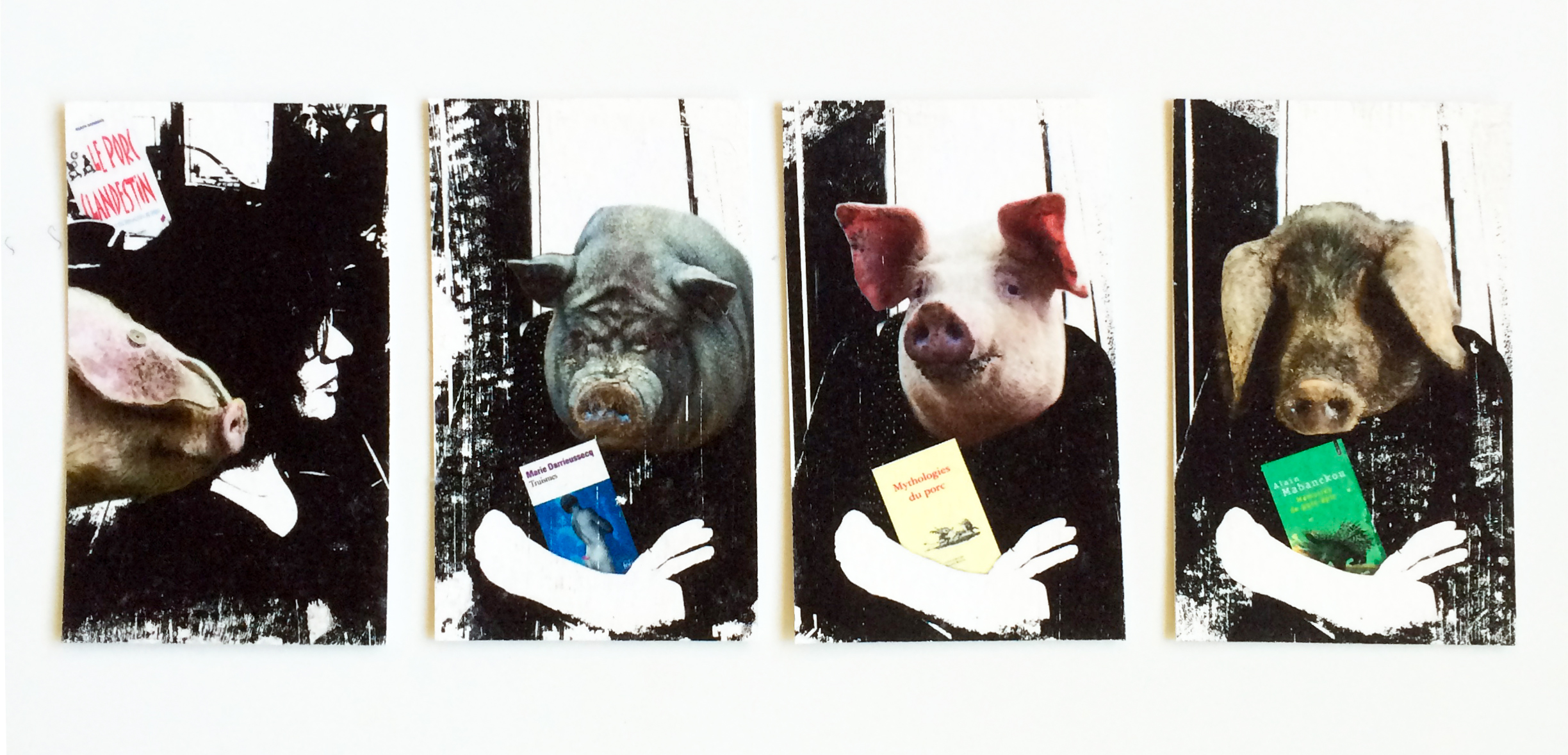 Pour cette exposition, je me suis intéressée à l’autoportrait, cette représentation imagée d’une personne par elle-même ! Peut-on se personnifier de façon impartiale ? Comment l’égo intervient-il dans cette incarnation de soi-même ? Pour le coup, j’ai décidé de ne pas me prendre trop au sérieux et, en jouant avec les mots, j’ai réalisé 4 autopor(c)traits. Ce qui n’est pas complètement dénué de sens car selon de récentes études le porc aurait un génome très proche de celui des humains !