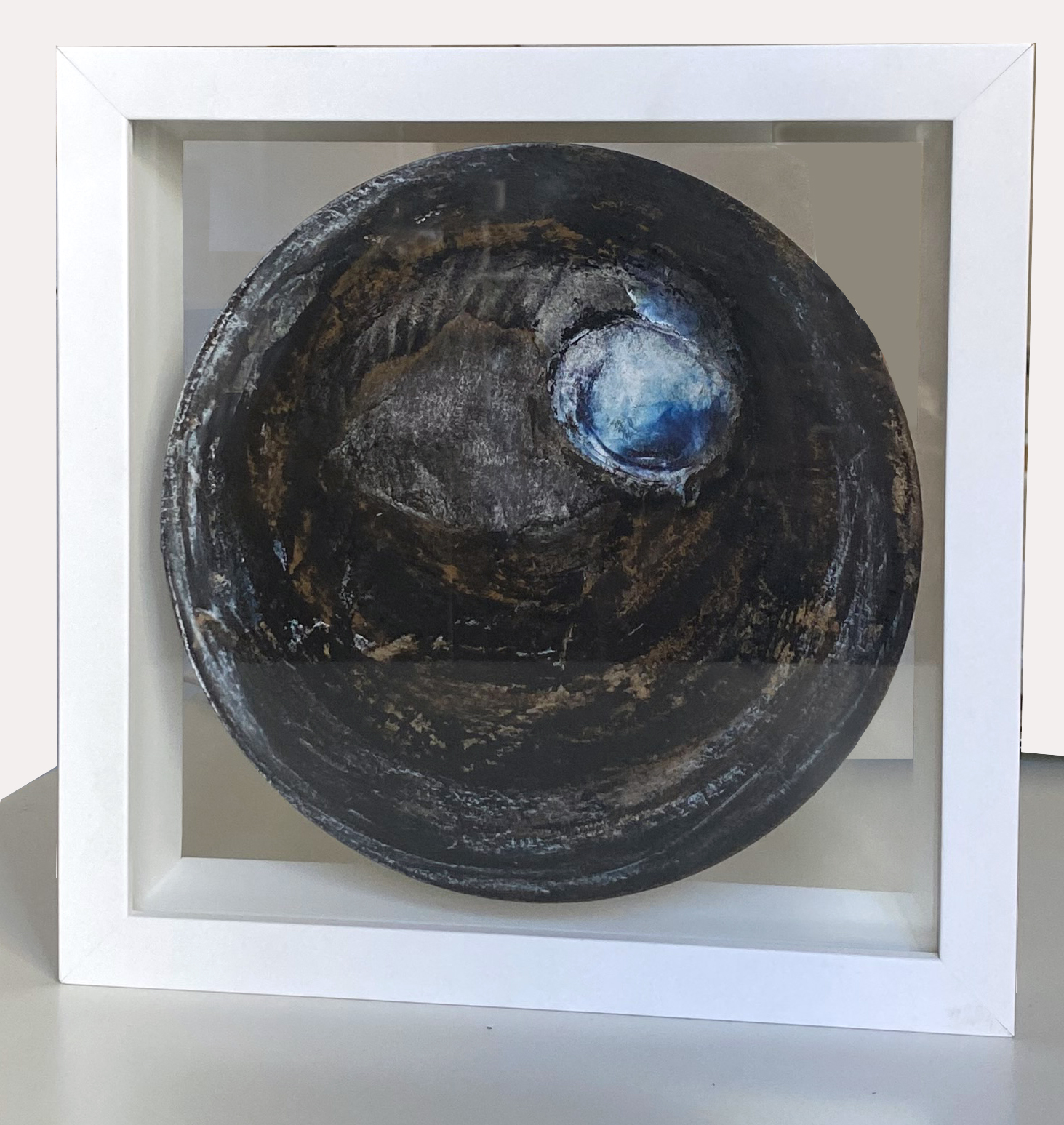 Tableau-objet, collage et technique mixte sur bois, diamètre 20cm, 2024
